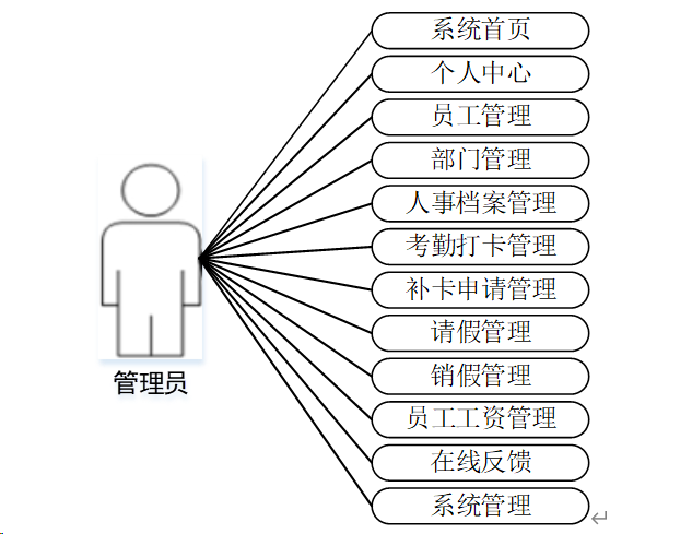 管理员模块:管理员是系统中的核心用户,管理员登录后,可以对后台系统进行管理。主要功能有:个人中心、员工管理、部门管理、人事档案管理、考勤打卡管理、补卡申请管理、请假管理、销假管理、员工工资管理、在线反馈、系统管理等功能。管理员用例如图3-1所示。