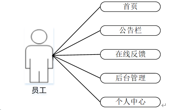 员工:员工进入系统可以对首页、公告栏、在线反馈、后台管理、个人中心等进行管理。员工用例如图3-2所示。