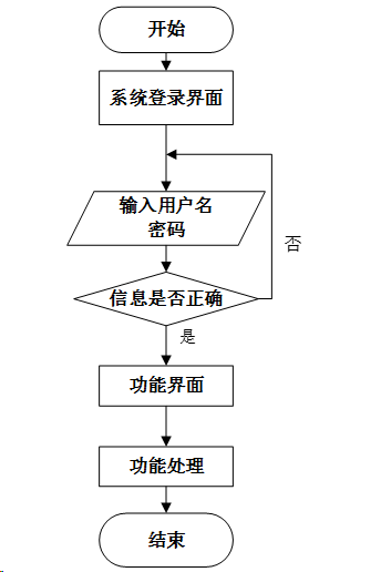用户登录系统时需要输入正确的用户名和密码,数据库在进行匹配核实后匹配结果正确才能进入系统,若错误则提示用户名或密码错误,即无法登录。操作流程如图3-5所示。