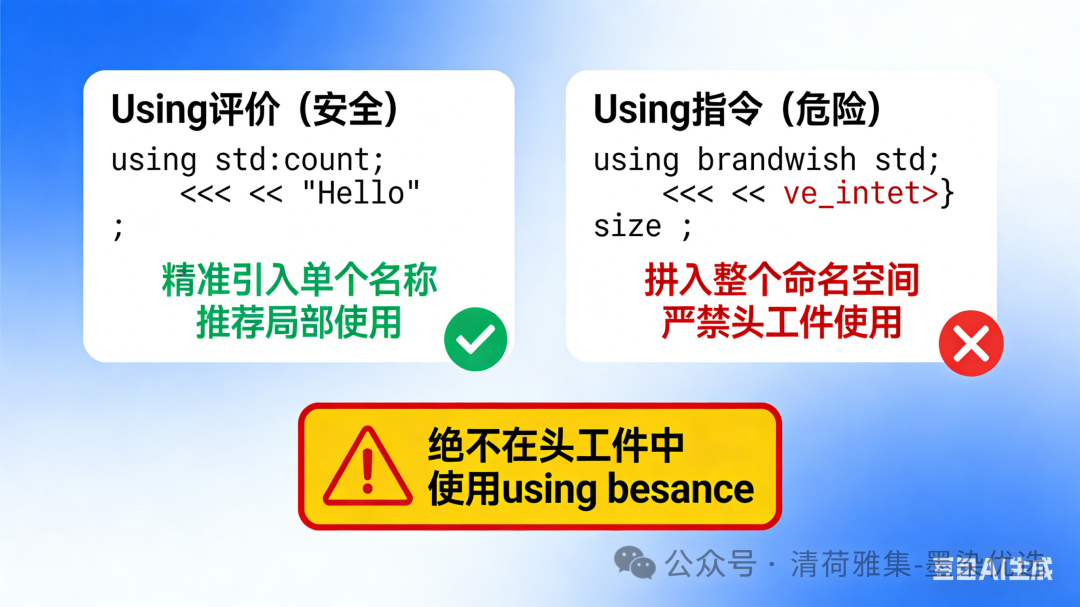 - 避免在全局作用域使用:尤其对 std 等大型命名空间。