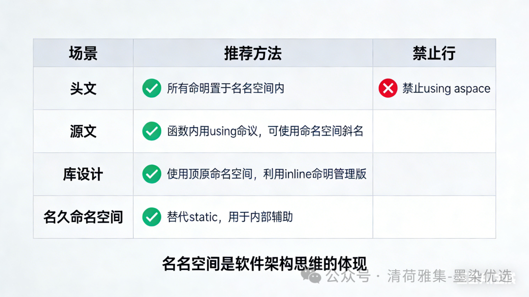 | 库设计 | ✅ 使用顶层命名空间(如 boost, fmt) ✅ 利用 inline namespace 管理版本 |