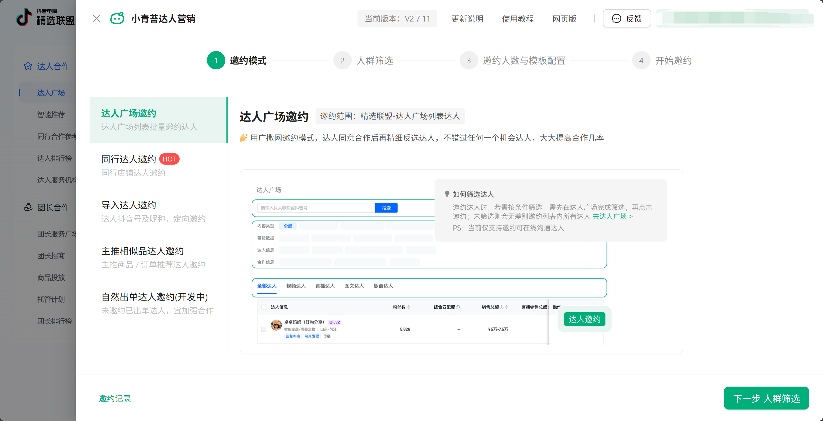 对于新手商家和商务BD来说,手动一个个去查找、筛选、联系达人确实耗时费力。这里想为你介绍一款能显著提升效率的专用工具——小青苔达人营销。它就的核心目标就是帮你把达人合作的“找、筛、邀、管”全流程变得更快、更省心。能够帮助商家更省时间邀约达人、更快捷的批量筛选达人、更高效的建联同行达人、高效一键处理达人消息、达人信息加入达人库等等一系列提效的功能。