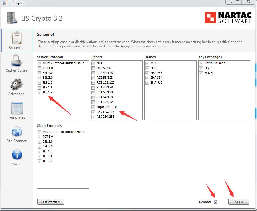 解压后,直接双击IISCrypto.exe,按照下面的选项勾选,然后点击“Apply”保存设置,然后点击“Reboot”重启服务器即可。