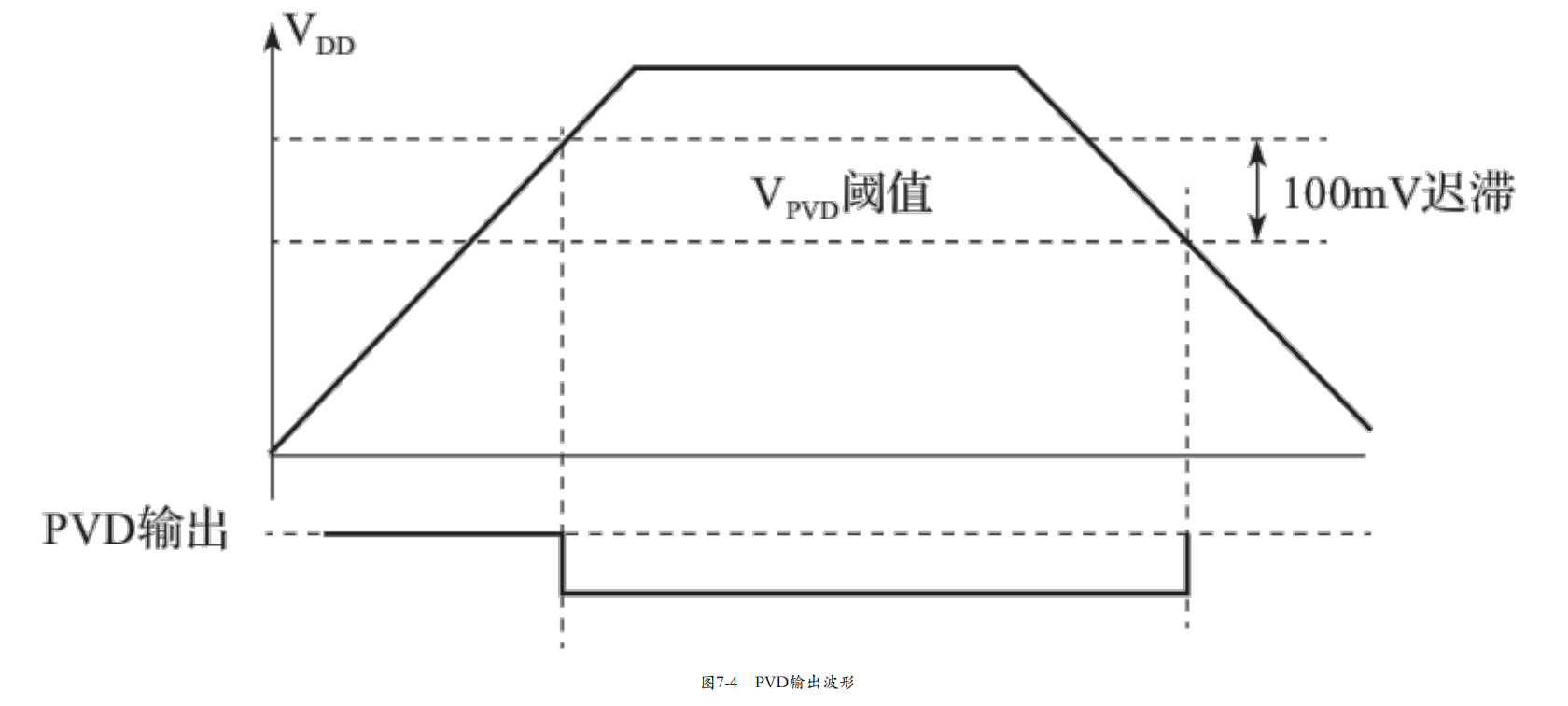 当PVDO置位时,该事件内部连接到外部中断的第16线上,当VDD下降到PVD阈值以下或当VDD上升到PVD阈值以上时,PVD输出触发信号的波形如图7-4所示。按照外部中断线16的触发设置,会在相应的边沿产生PVD中断请求。