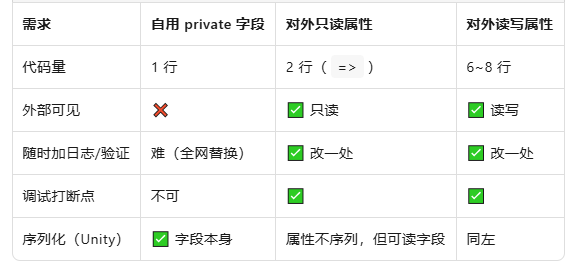 核心原则2:仅类内部使用,用私有字段;需要控制访问权限/加逻辑/跨脚本访问,用属性