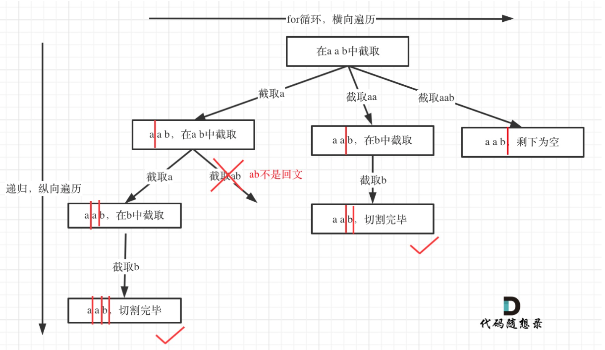 从树形结构的图中可以看出:切割线切到了字符串最后面,说明找到了一种切割方法,此时就是本层递归的终止条件。