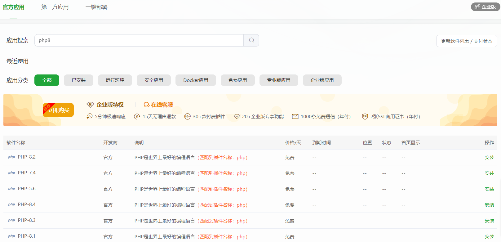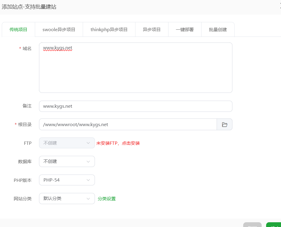 在软件商店安装php8(我这里安装的是php5.4),mysql7,nginx等软件后,进入网站菜单创建项目。