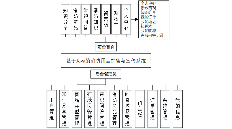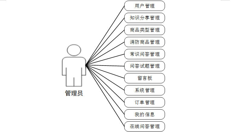 用户功能由个人中心、修改密码、知识分享、我的订单、我的地址、在线问答记录、错题本、我的收藏等功能组成。能对自己的个人信息和密码进行修改,修改前需要先成功登录本系统,还可以对消防商品进行查询,并进行添加到购物车、立即购买、评论或收藏操作;