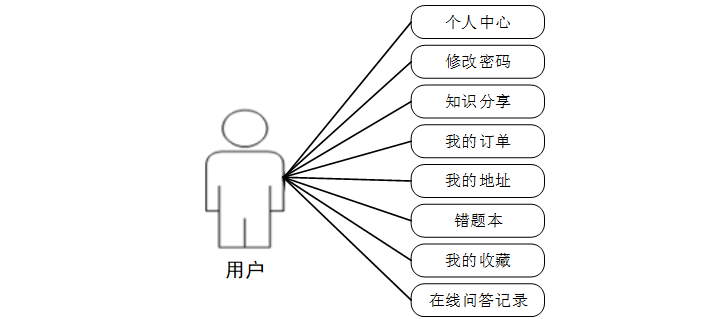 用户端:注册登录、个人信息维护、密码修改、商品搜索/筛选、商品详情、购物车、立即购买、订单管理、地址管理、在线支付、物流跟踪、商品收藏、商品评论、知识分享(浏览、点赞、收藏、评论)、在线问答、错题本、系统公告、留言板。