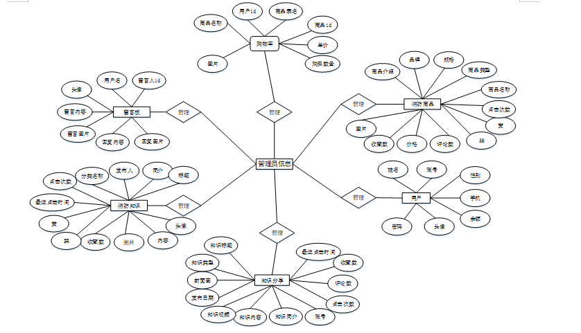 该系统使用免费开源的MySQL数据库,这是一个功能齐全的关系数据库管理系统。系统使用Navicat管理数据库。系统数据库统一使用UTF-8,避免了中文的乱码问题。MYSQL数据库一直以来都是被广泛应用的存在,它能为系统带来简洁的SQL书写以及良好的存储环境,它对分库分区有很大的帮助以减轻单表数据太多带来的压力。根据系统的实体,分析数据库之间的关系,总结出E-R图,而E-R图又以多个实体属性图组成;以下将“用户、消防商品、知识分享、购物车、消防知识、留言板”等作为实体,它们的局部E-R图,如图4-2所示: