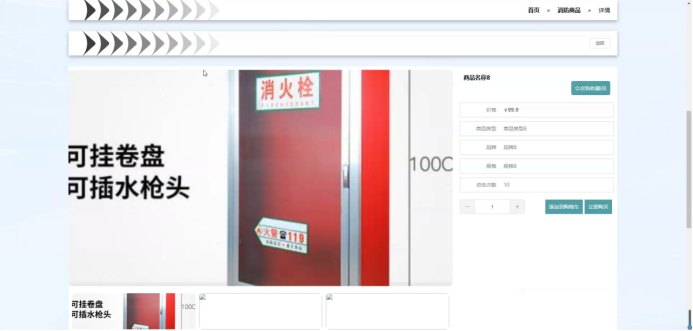消防商品:在消防商品页面的输入栏中输入商品名称、品牌、价格进行查询消防商品详细信息,并根据需要进行添加到购物车、立即购买、评论或收藏操作;消防商品页面如图5-4所示: