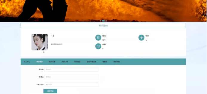 用户注册登录进入系统,点击个人中心可以对个人中心、修改密码、知识分享、我的订单、我的地址、在线问答记录、错题本、我的收藏等功能进行操作。个人中心页面如图5-5所示: