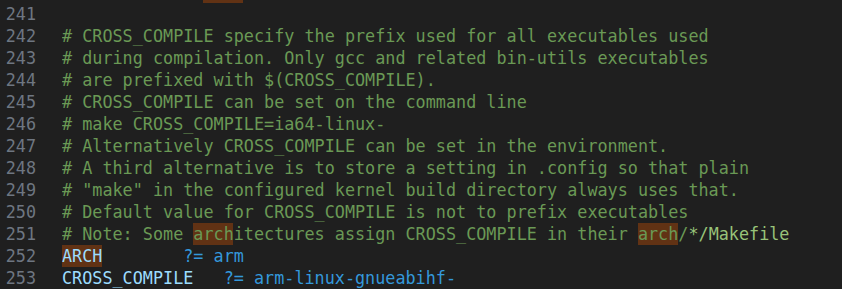 上图中第 252 和 253 行分别设置了 ARCH 和 CROSS_COMPILE 这两个变量的值,这样在编译的时候就不用输入很长的命令了。