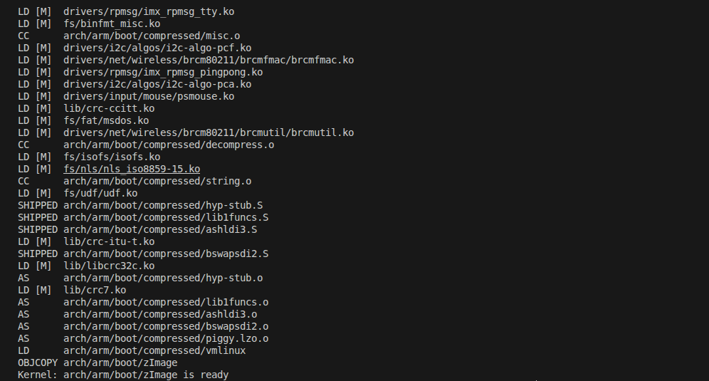 编译完成以后就会在目录 arch/arm/boot 下生成 zImage 镜像文件。在 arch/arm/boot/dts 目录