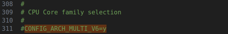 打开 imx_alientek_emmc_defconfig 文件,找到“CONFIG_ARCH_MULTI_V6=y”这一行, 将其屏蔽掉,如下图所示: