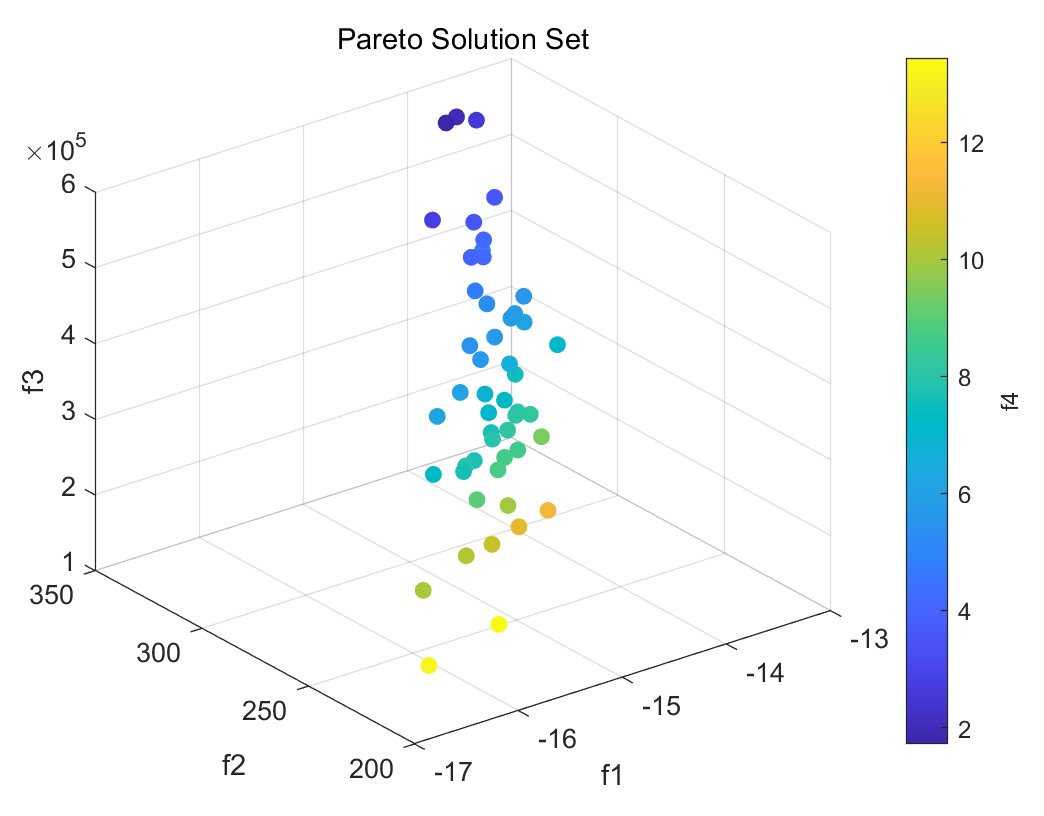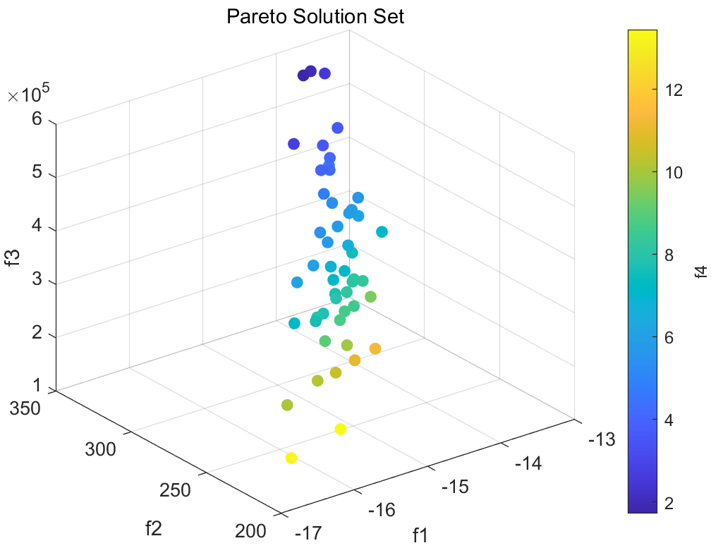 首先是帕累托解集图,如果你只有1-2个目标,那帕累托解集图就是二维的,3个目标就是三维的,我们的案例数据是4个目标,4个目标不大好可视化,因此用颜色表示第四个目标(超过4个目标就不好绘制了):