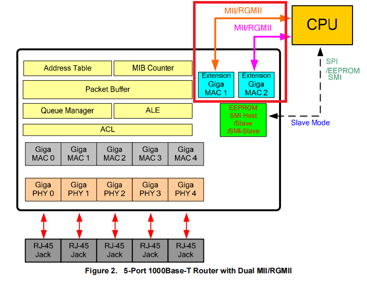 RTL8367RB支持多功能通用接口,可配置为MII/RGMII模式,用于扩展GMAC接口。RTL8367RB支持两个扩展接口(扩展GMAC0和扩展GMAC1),用于在特定应用中与外部PHY、MAC或CPU连接。这些扩展接口通过寄存器配置支持RGMII、MII MAC模式或MII PHY模式。