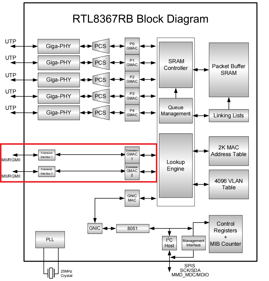 RTL8367RB的扩展GMAC1和扩展GMAC2支持双RGMII接口,以便在寄存器配置设置为RGMII模式接口时与外部MAC或PHY设备连接。