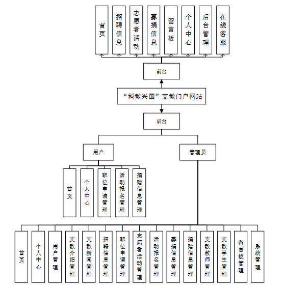 通过前面的功能分析可以将“科教兴国”支教门户网站的功能分为管理员和用户两个部分,系统的主要功能包括首页、个人中心、用户管理、支教介绍管理、支教新闻管理、招聘信息管理、职位申请管理、志愿者活动管理、活动报名管理、募捐信息管理、捐赠信息管理、支教教师管理、支教学生管理、留言板管理、系统管理等内容。任何用户只要进入网站不需登录也可浏览到的信息,后台管理是针对已登录的用户看到满意的“科教兴国”支教门户信息而设计的。