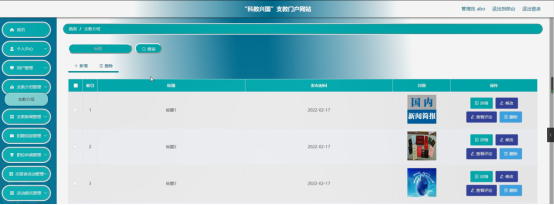 支教新闻管理,在支教新闻管理页面可以对索引、标题、标签、发布时间、封面等内容进行详情,修改,查看评论和删除等操作,如图5-11所示。