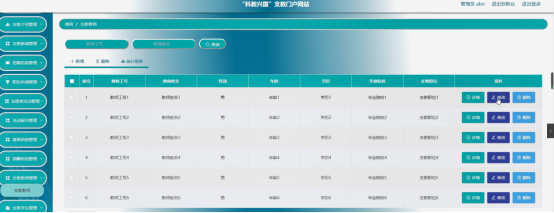 支教教师管理,在支教教师管理页面可以对索引、教师工号、教师姓名、性别、年龄、学历、毕业院校、支教职位等内容进行详情,修改和删除等操作,如图5-15所示。