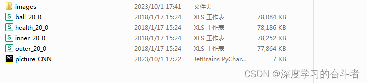 每种工况下有:ball(滚动体故障)、health(健康)、inner(内圈故障)、outer(外圈故障)
