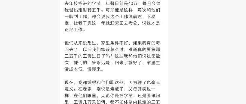 他们看到外面很多人35岁危机,或者说焦虑,或者说裁员失业,他们知道铁饭碗是旱涝保收的,他们知道很多铁饭碗都会很滋润,所以他们希望孩子不要受苦,应该去选择铁饭碗。