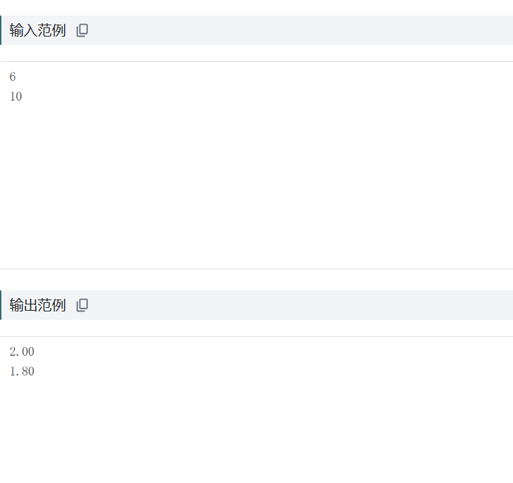 对于每一组测试数据,你写的程序要求计算出一组相应的运算结果,并将这一组运算结果作为你所写程序的输出数据依次写入到标准输出设备中。每组运算结果为一个浮点数,就是所求的比值,保留2位小数。每组运算结果单独形成一行数据,其行首和行尾都没有任何空格,每组运算结果与其后一组运算结果之间没有任何空行,第一组运算结果前面以及最后一组运算结果后面也都没有任何空行。(注:最后求得的比值保留2位小数。) 注:通常,显示屏为标准输出设备。
