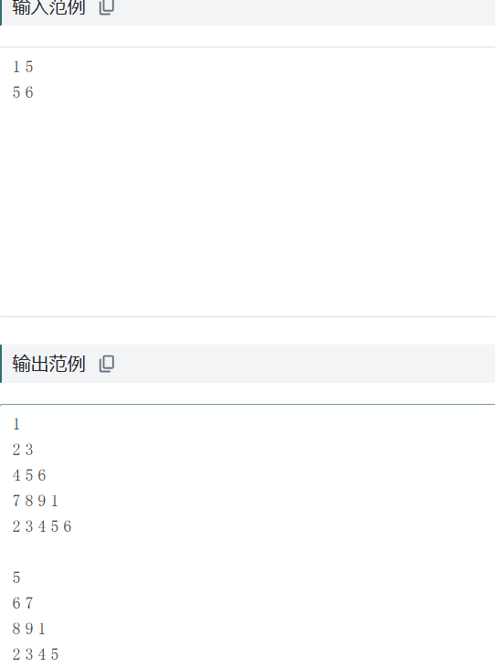 2.本题多组输出涉及组内换行与组外换行。组内:观察可知当每行的单行输出数字与行数相等时需要换行。组外:采用定义一个标识 first_case 的方法;