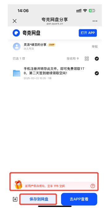 使用手机打开夸克 APP,保存以下资源可获取 1T 存储空间