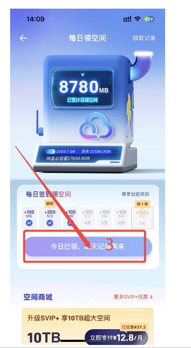新老用户都可领取,每天可领取 1 次,1 周内连续签到,周二和周日可以领取更多容量!SVIP 每天最低可领取 100MB,周二领取 200MB,周日领取 1GB!!!