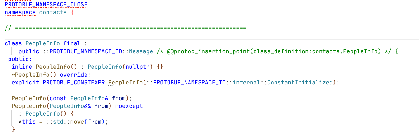 可以看到proto编译器为我们生成的命名空间"contacts"和类"PeopleInfo"