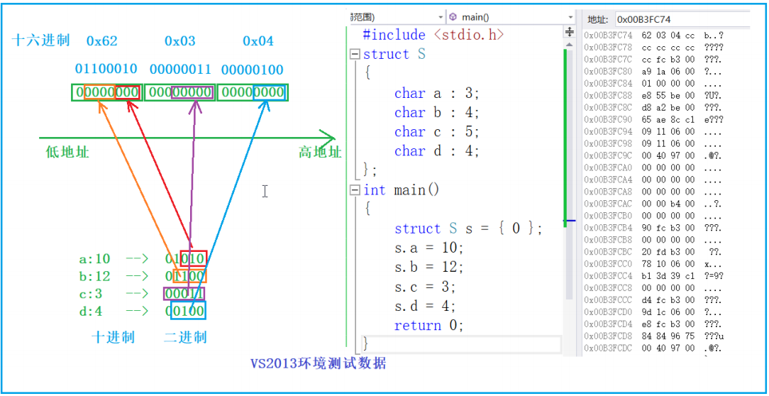 ★实测:上面的 struct A 的大小为 8 字节(2+5+10+30=47 比特,需 6 字节,但因对齐规则分配 8 字节),而若用普通结构体(4 个int),大小为 16 字节,空间节省 50%。
