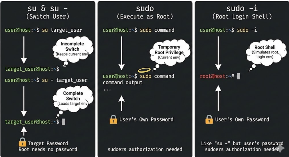 密码:通常需要输入目标用户的密码(su – root 就是 root 密码);root 自己 su 到别人不需要密码。