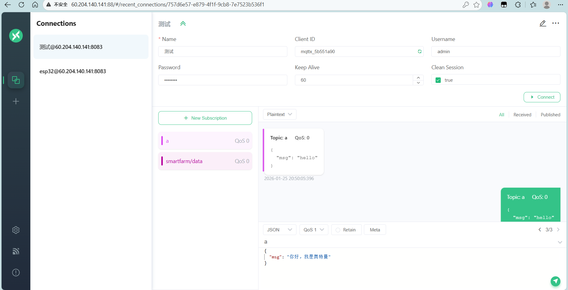 访问服务mqttx-web:http://60.204.140.141:88/ 这里60.204.140.141你的服务器IP,第一次进入会让你连接MQTT服务器,主播连过了就没有了