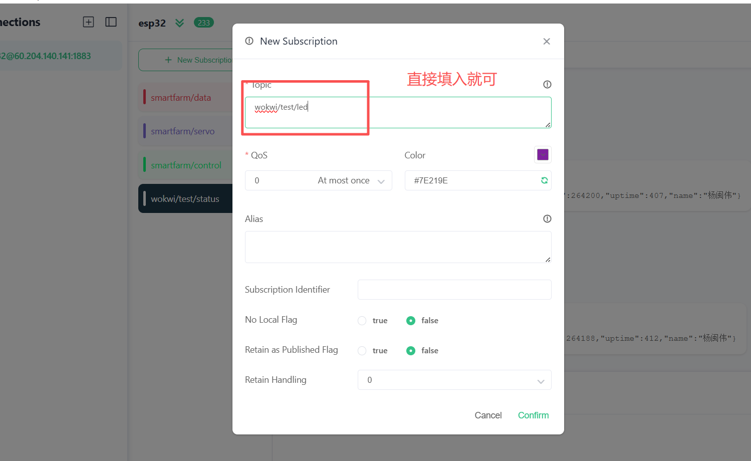 有两个主题一个控制的:wokwi/test/led,一个状态的:wokwi/test/status,这里wokwi/test/led订阅发送的指令,esp32接收到处理完后会将信息反馈到wokwi/test/status订阅中。