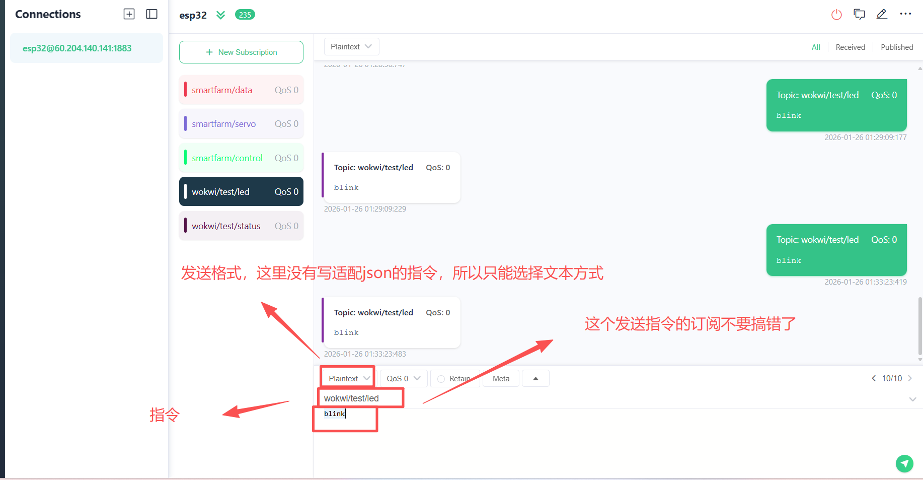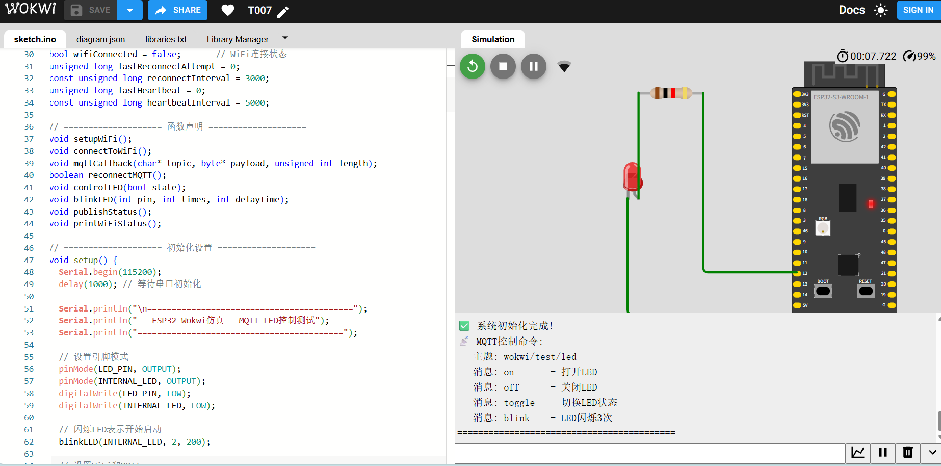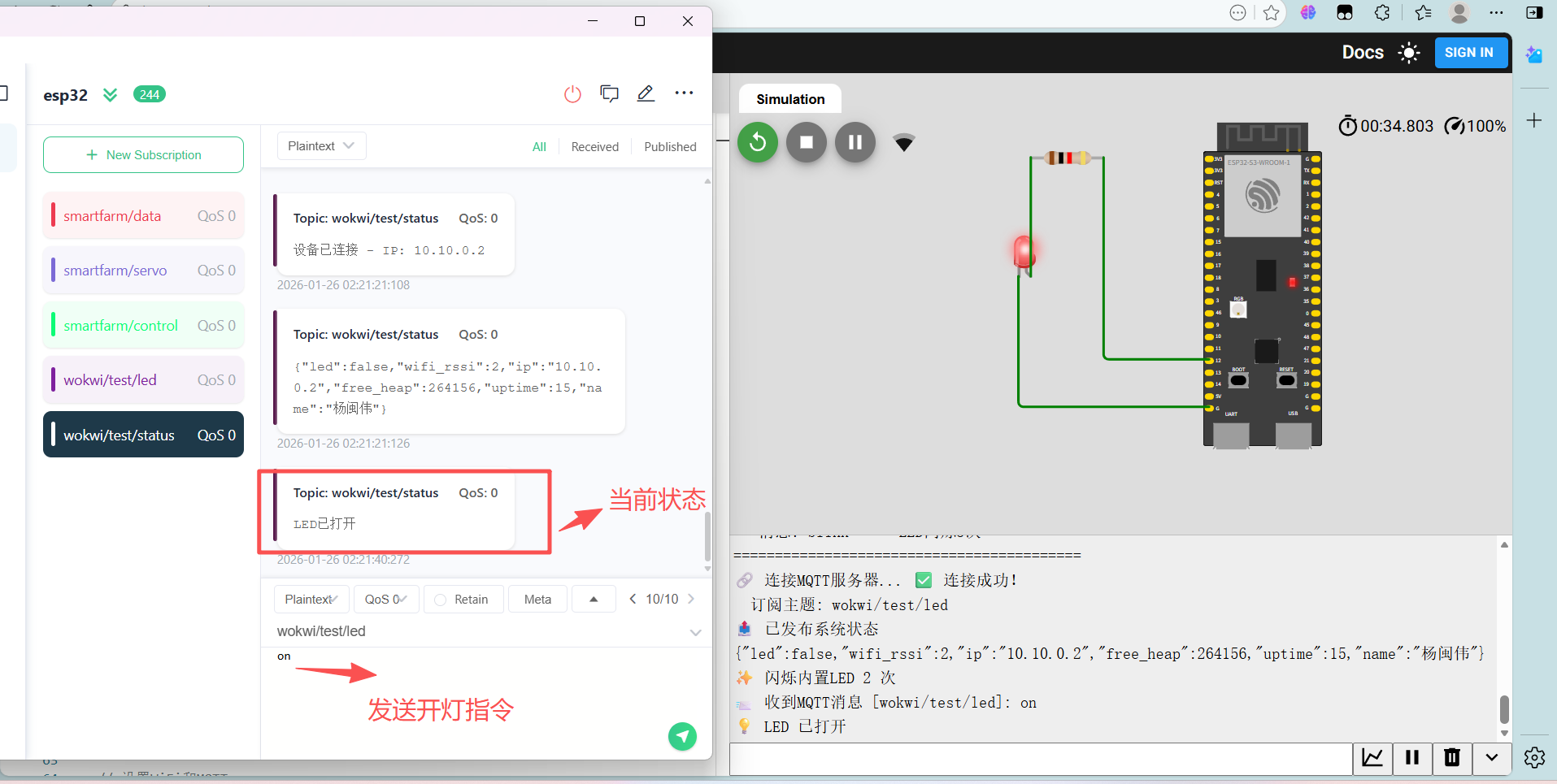 当wokwi/test/led订阅发送指令。仿真平台的esp32会接收并处理指令,然后再返回状态