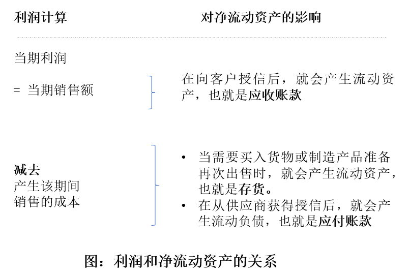 从图中可以看到,在利润计算和净流动资产之间有三个直接联系: