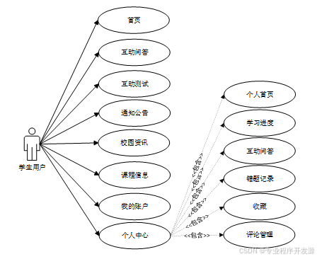 学生用户主要对用户注册、用户登录、课程浏览、学习进度提交、互动测试参与、账户信息修改等用例进行功能测试。