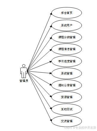 管理员主要对用户管理、课程管理、测试管理、学习进度监控、系统通知发布、数据备份与恢复等用例进行功能测试。