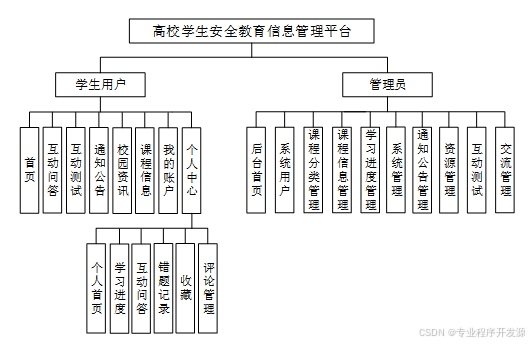 高校学生安全教育信息管理平台旨在通过集成多种功能模块,为学生用户提供一个全面的学习与交流环境,同时为管理员提供高效的资源管理和数据分析工具。系统涵盖了课程学习、互动问答、在线测试、通知公告、个人中心等核心板块,并提供了详细的数据统计分析和后台管理功能,以支持个性化学习体验和系统的高效运作。具体功能如下: