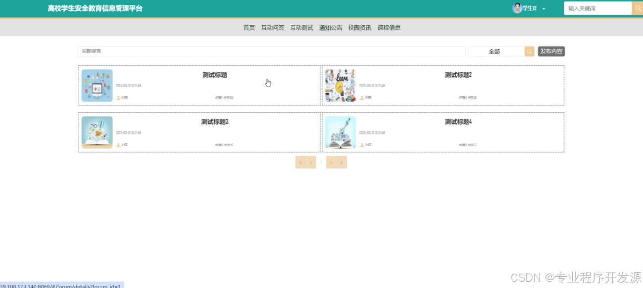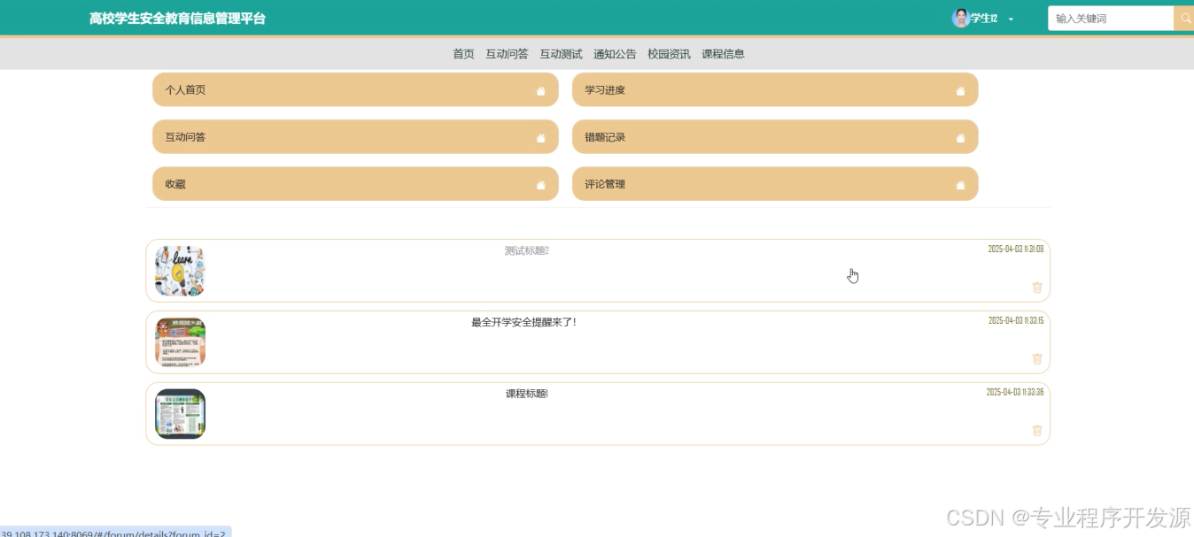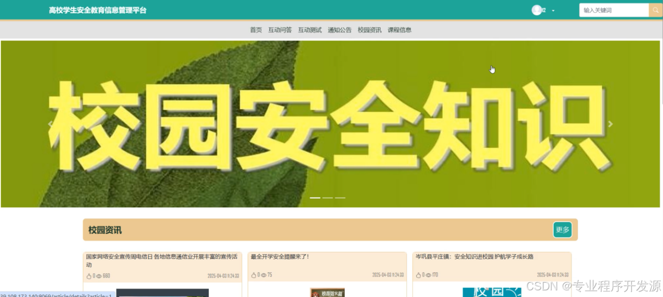 随着信息技术的迅速发展,高校学生安全教育的需求日益增加,但传统的教育模式存在教育资源分散、管理效率低下及学生参与度不高等问题。本系统基于Spring Boot框架开发了一个面向高校学生的安全教育信息管理平台,旨在提高教育质量和管理效率。系统分为学生用户和管理员两大模块,学生用户可以访问首页、互动问答、互动测试、通知公告、校园资讯、课程信息等板块,并能通过智能推荐获取个性化学习内容;管理员则负责后台数据统计分析、系统用户与资源管理等工作。采用MySQL数据库存储数据,并利用协同过滤算法实现首页内容的智能推荐。系统设计注重用户体验和管理便捷性,实现了前后端分离,提高了扩展性和可维护性。通过该平台,不仅能够增强学生的安全意识和知识技能,同时也简化了管理人员的工作流程,提升了整体教育效果与管理水平。