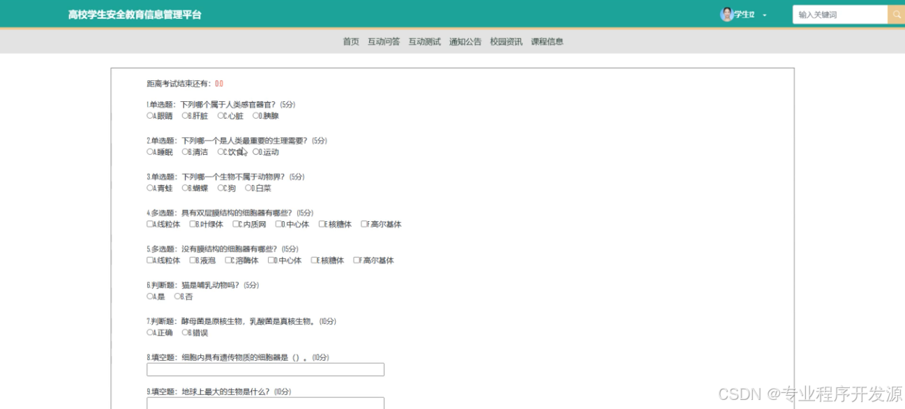 在互动测试模块中,用户可以根据需求选择不同的考试科目,点击开始答题后,系统会展示一个倒计时,用户需要在60分钟内完成所有题目。答题过程中,选择题和判断题将自动评卷,系统会即时给出分数;而客观题部分则需要管理员人工评分。用户完成答题并提交后,系统会展示考试名称、答题时长、总分以及详细的得分情况,便于用户查看和分析自己的答题表现。互动测试界面展示如下图5-12所示。