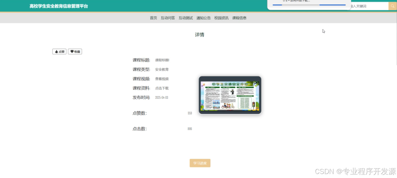 课程信息:展示详细的课程资料和视频,支持点赞、收藏及评论,便于学生学习和反馈。