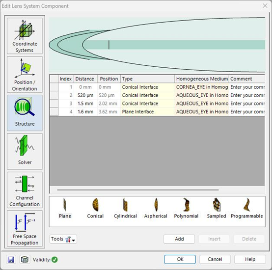 Lens System Component允许用户轻松定义一个由平滑表面和各向同性的同质介质组成的组件。对于表面和材料,您可以从内置目录中选择现成的条目,也可以自定义条目,以获得最大的灵活性。