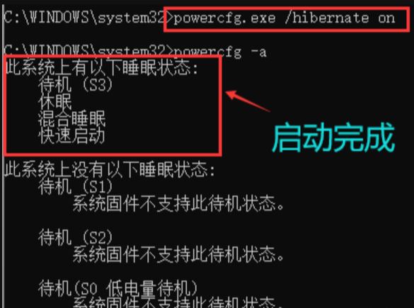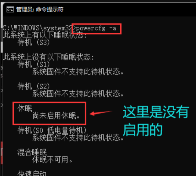 2.输入命令:powercfg -a ,查看笔记本的休眠有无启用。