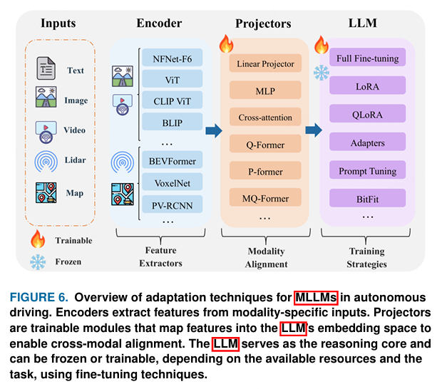 图6. 自动驾驶中多模态大语言模型(MLLMs)适配技术概览。编码器从特定模态的输入中提取特征。投影器是可训练模块,将特征映射到大语言模型的嵌入空间,以实现跨模态对齐。大语言模型作为推理核心,可以根据可用资源和任务需求选择冻结或可训练,使用微调技术进行优化。(图注)