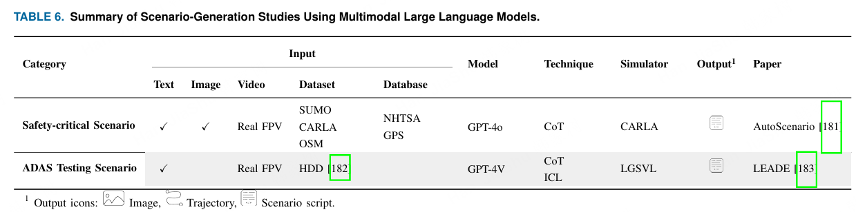 如表6所示,只有两项研究探索了基于MLLM的情景生成:一项针对安全关键情景,另一项侧重于ADAS测试。这凸显了一个显著的研究空白,并表明VOLUME和MLLM在这一领域的更广泛潜力仍然 largely 未被探索。未来的工作可以扩展到其他应用,如驾驶策略评估、闭环情景生成以及复杂真实驾驶事件的重建。(数量少,应用窄)