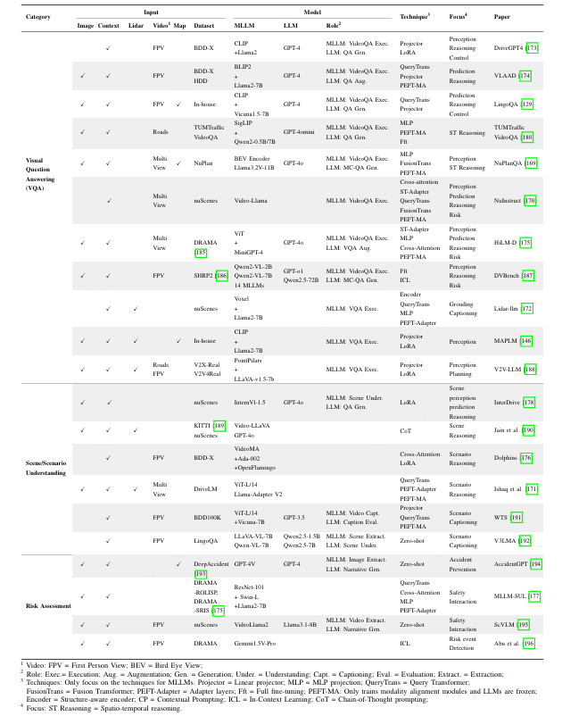 1 视频:FPV=第一人称视角;BEV=鸟瞰视角; 2 角色:Exec.=执行;Aug.=增强;Gen.=生成;Under.=理解;Capt.=字幕生成;Eval.=评估;Extract.=提取; 3 技术:只关注用于多模态大语言模型(MLLMs)的技术。Projector=线性投影器;MLP=多层感知机投影;QueryTrans=查询变换器;FusionTrans=融合变换器;PEFT-Adapter=适配器层;Fft=全量微调;PEFT-MA=只训练模态对齐模块且大语言模型冻结;Encoder=结构感知编码器;CP=上下文提示;ICL=上下文学习;CoT=链式思维提示; 4 关注:STReasoning=时空推理。