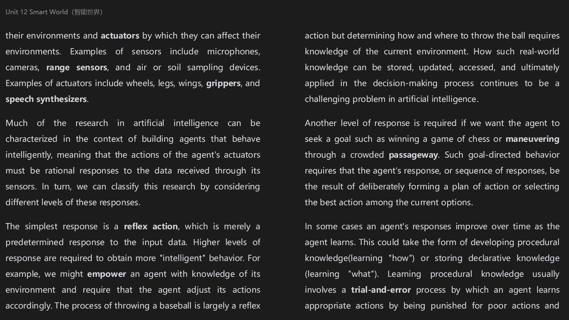 代理是一个回应环境刺激的设备。很自然的设想代理就像单个机器例如机器人,尽管代理可能有其他形式比如一个自主飞机,一个交互式视频游戏的角色或者是一个在互联网上与其他进程进行交流的进程(可能是客户端,服务器或者对等体)。很多代理有传感器,通过传感器他们接收来自环境以及能够影响环境的执行器的数据。传感器的例子包括麦克风,相机,距离传感器和空气或土地采样设备。执行器的例子包括轮子,腿,翅膀,夹子和语音合成器。